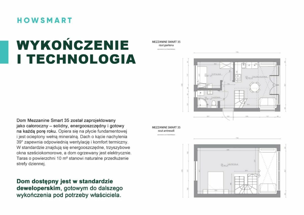 Dom Mezzanine Smart 35 został zaprojektowany jako całoroczny - solidny, energooszczędny i gotowy na każdą porę roku. Opiera się na płycie fundamentowej i jest ocieplony wełną mineralną. Dach o kącie nachylenia 39 stopni zapewnia odpowiednią wentylację i komfort terminczny. W standardzie znajdują się energooszczędne, trzyszybowe okna sześciokomorowe, a dom ogrzewany jest elektrycznie. Taras o powierzchni 10 m² stanowi naturalne przedłużenie strefy dziennej.